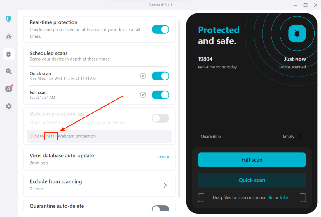 - Here, you will find the Webcam protection feature. You'll have to install it if it is your first time using it. Do so by pressing the install button.