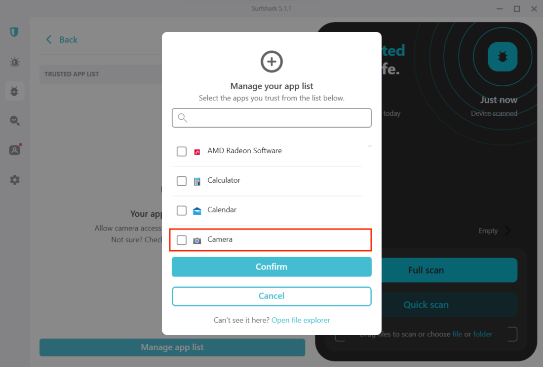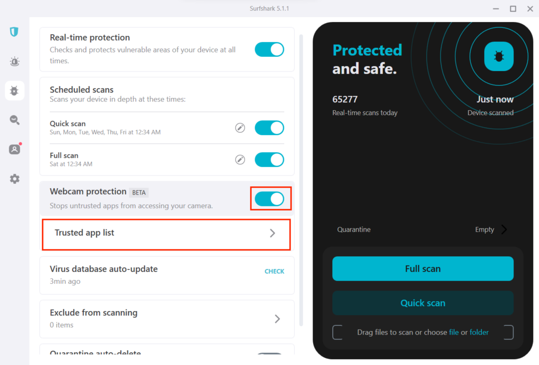 - Toggle the Webcam protection feature. Click on the Trusted app list to choose which apps can access your webcam.