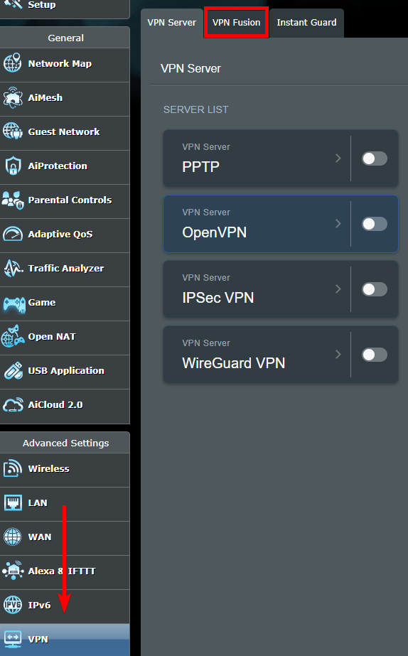 - On your router's web panel interface's left side, look for the VPN option and click on it. Select the VPN Fusion tab.