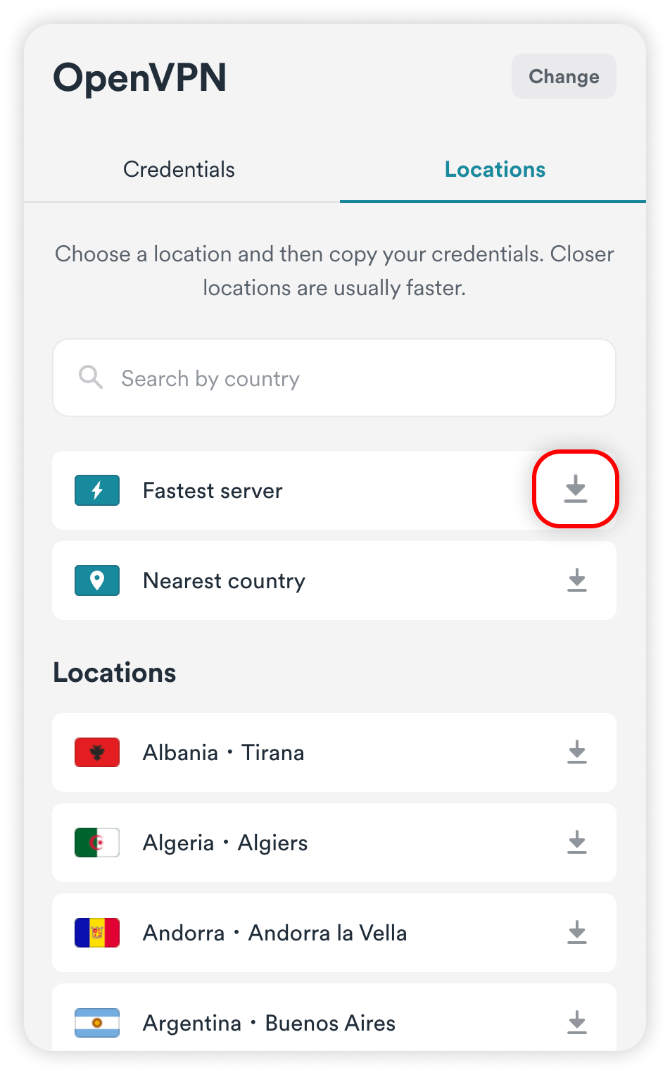 For the username and password, you must use the credentials generated in the Find your login details section. - Import the server configuration file by clicking on Import .ovpn file from the choose a Surfshark server section.