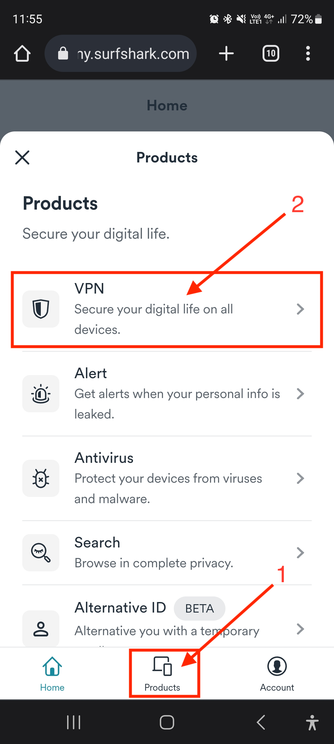1. Go to Surfshark's login page and log in. Then, click Products > VPN.