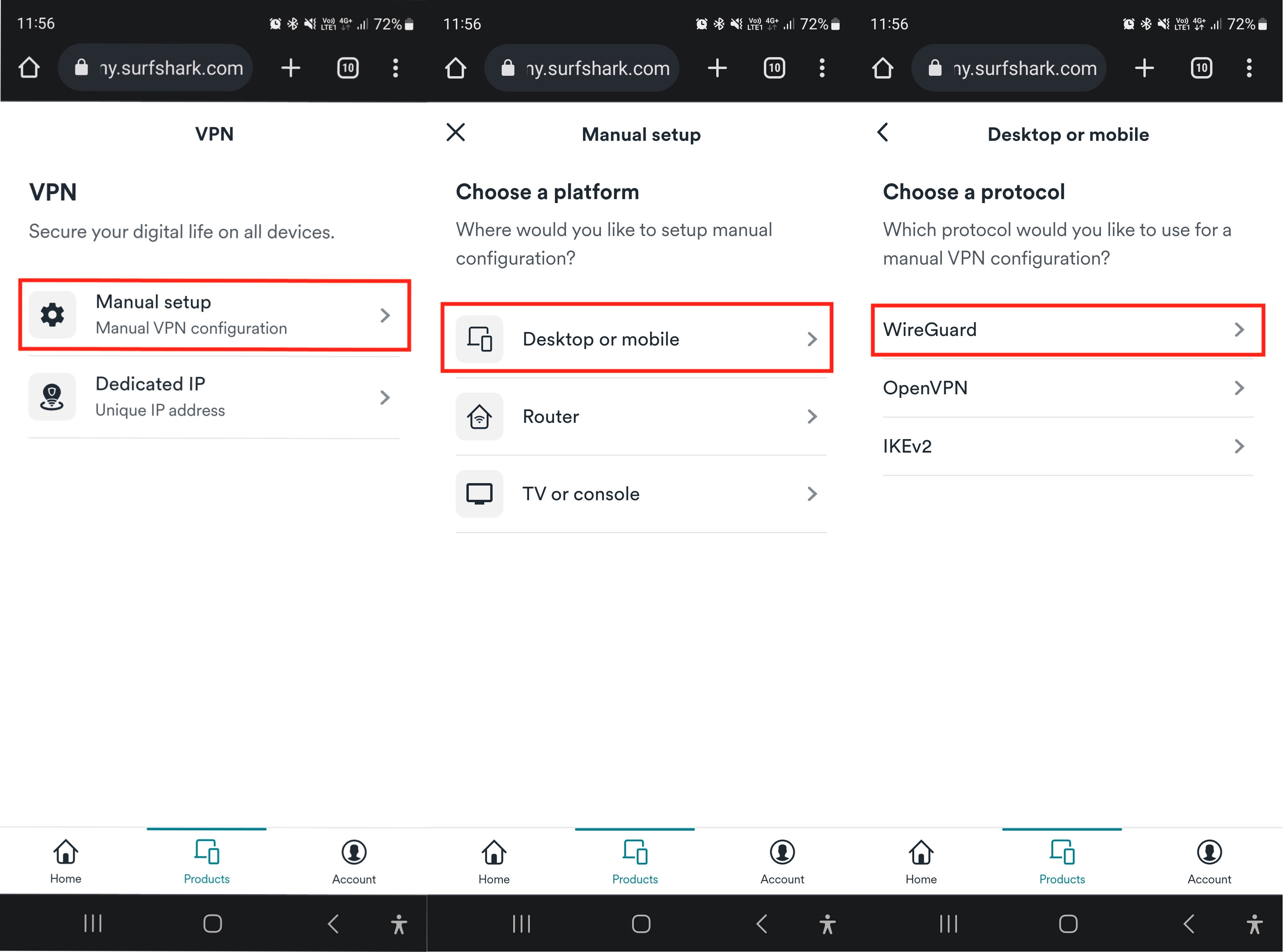 2. In the VPN section, tap Manual setup, select Desktop or mobile, and WireGuard.
