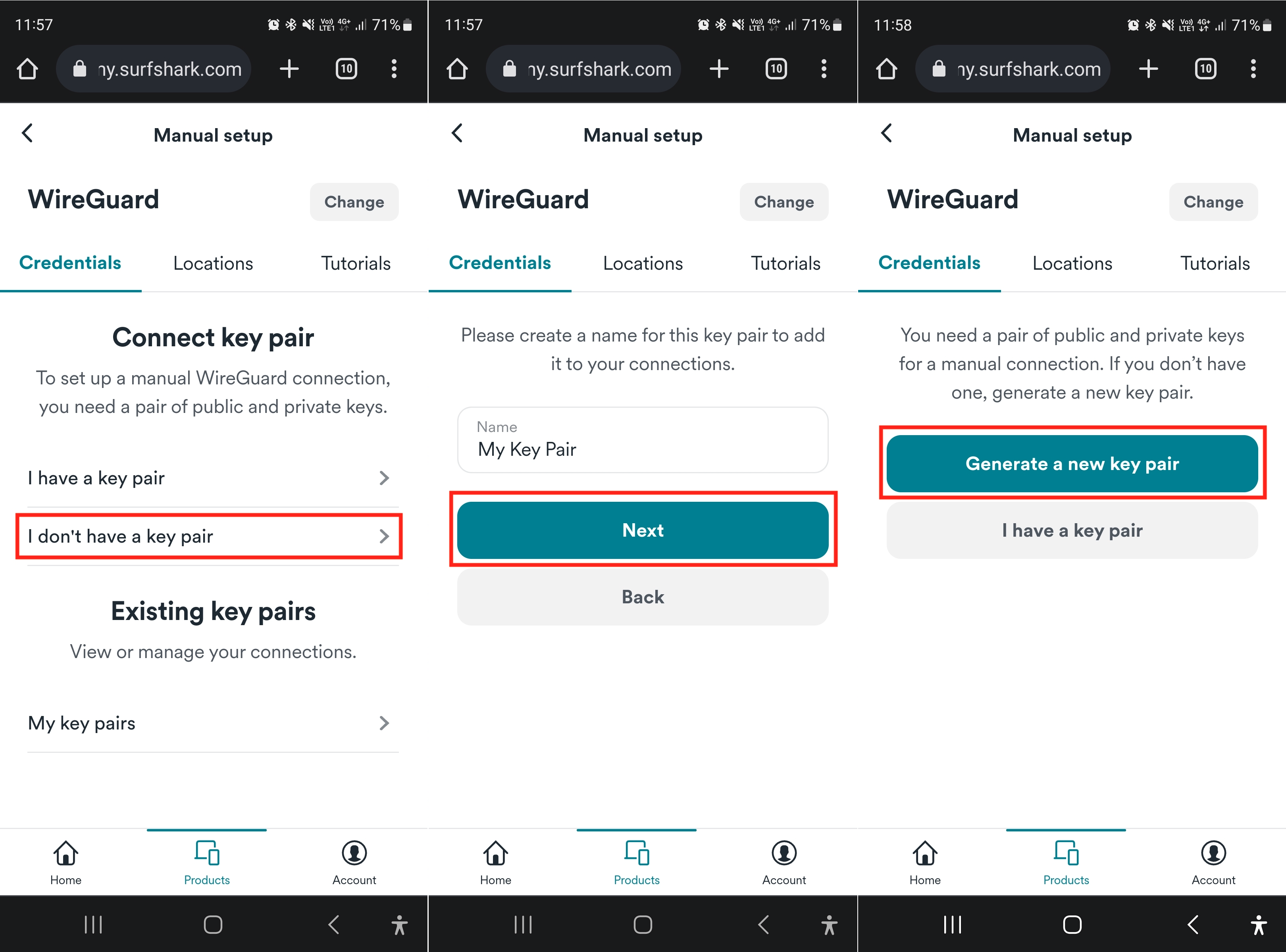 3. Then, tap on I don't have a key pair, enter a name of your choice, and tap Next. Proceed to the next screen by pressing Generate a new key pair.