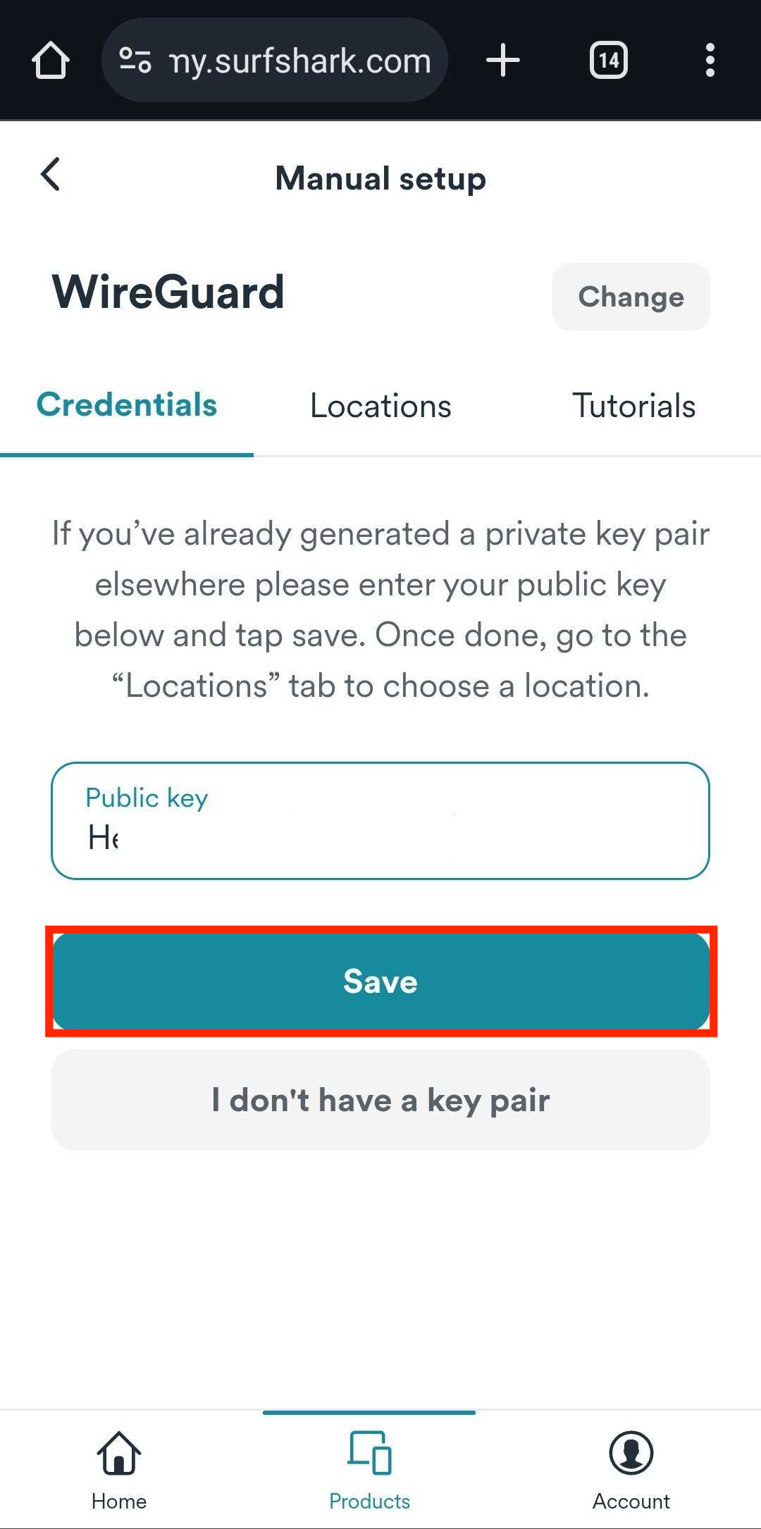 Once you have your key pair, you can proceed by pressing on the Locations tab. Once there, tap the download icon of the server to download the configuration file.