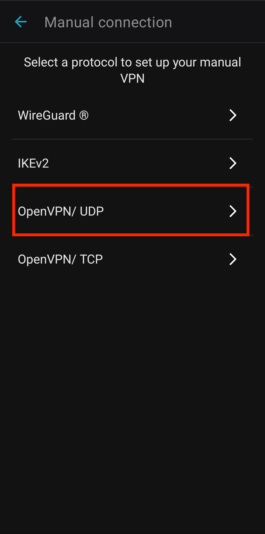 NOTE: The steps are identical when connecting via OpenVPN TCP or IKEv2.
