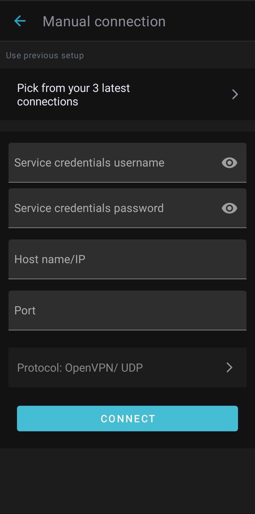 7. Input the credentials and server Host name as seen in the screenshot below. If you wish to change the protocol from OpenVPN/ UDP to TCP or IKEv2, tap on the Protocol button. Once you are done, tap CONNECT.