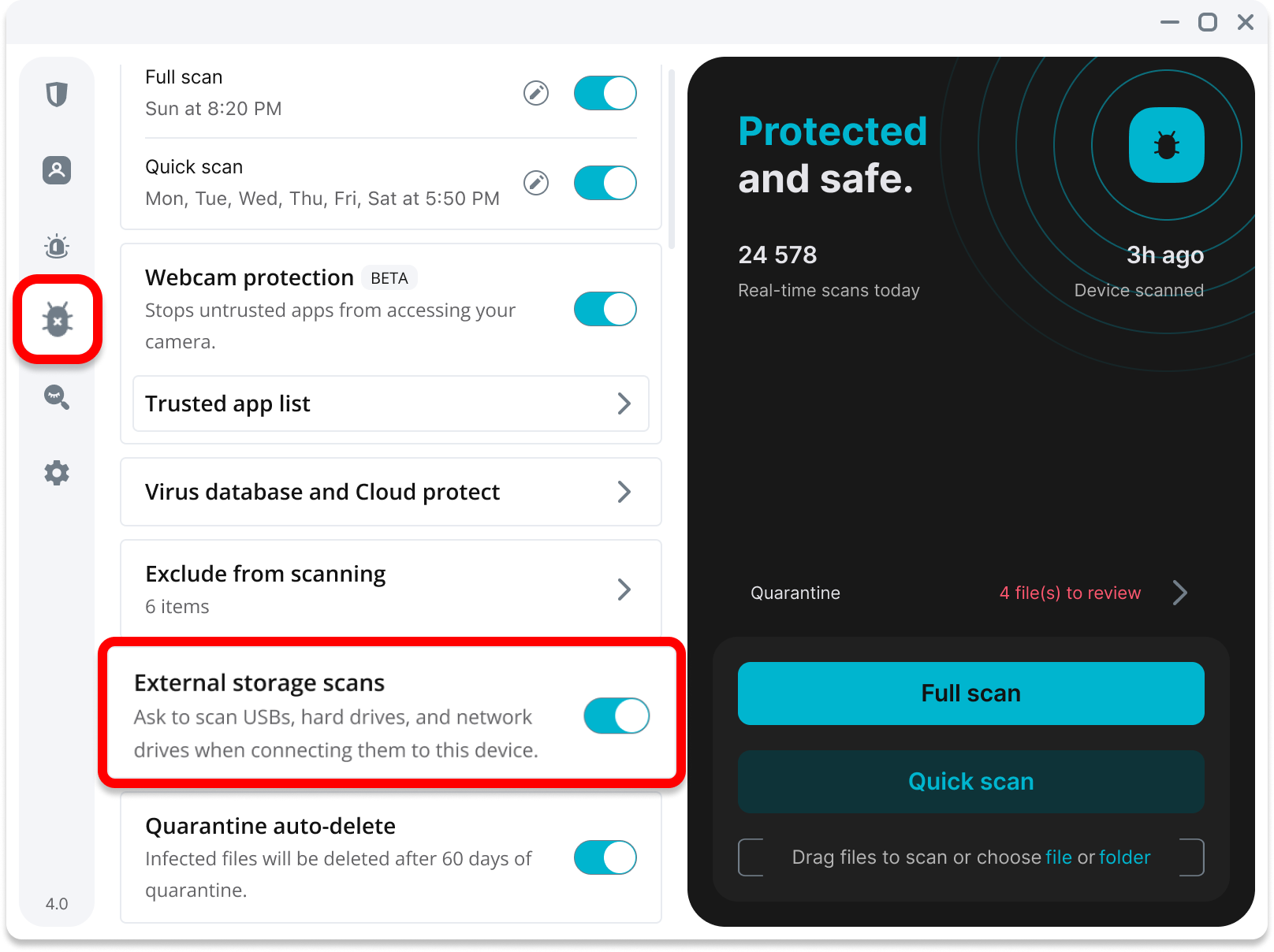 1. Open the Antivirus menu on the left, scroll down, and toggle the External storage scans switch to the on position.