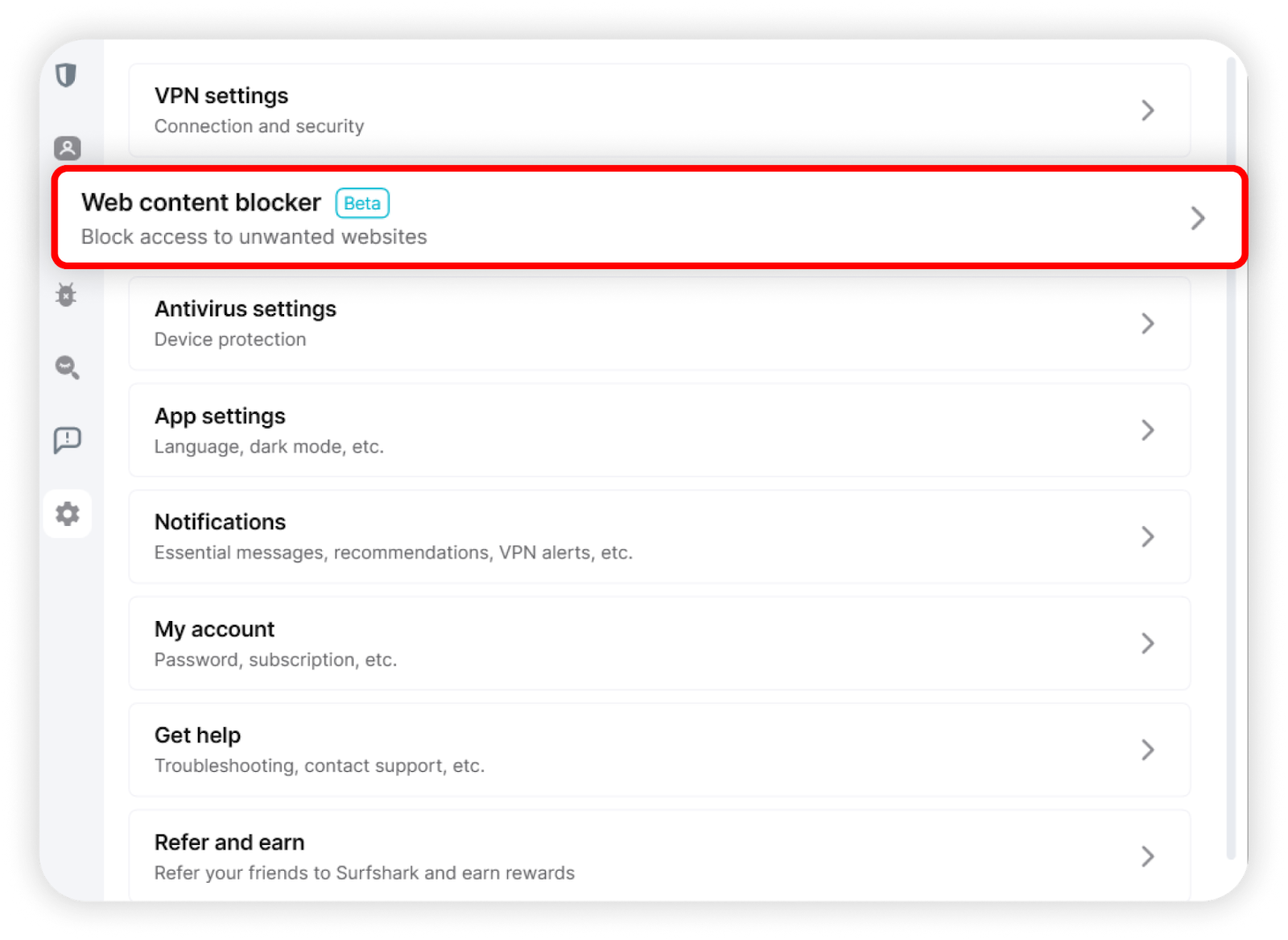 Follow the steps below to enable web content blocker in the Surfshark app: