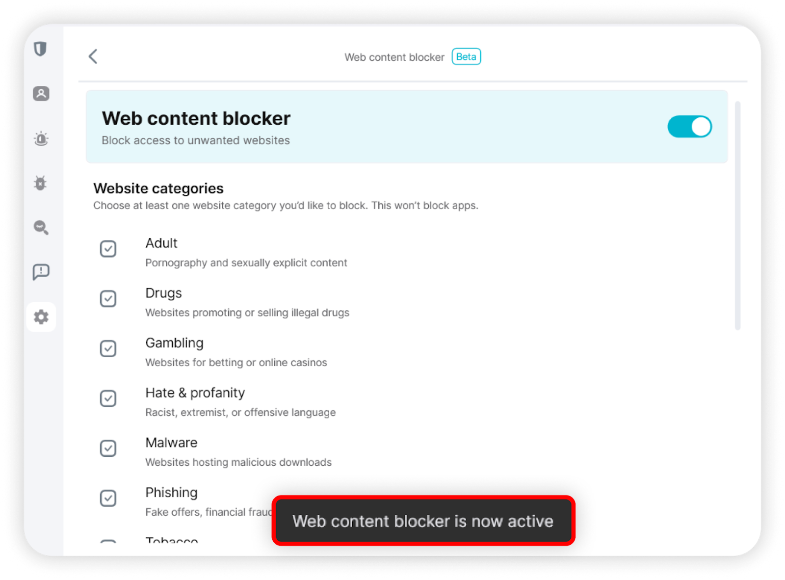 Web content blocker is a Surfshark One and Surfshark One+ feature that allows you to block access to your chosen website categories. These include, but are not limited to, adult, drug, gambling, and weapon websites.