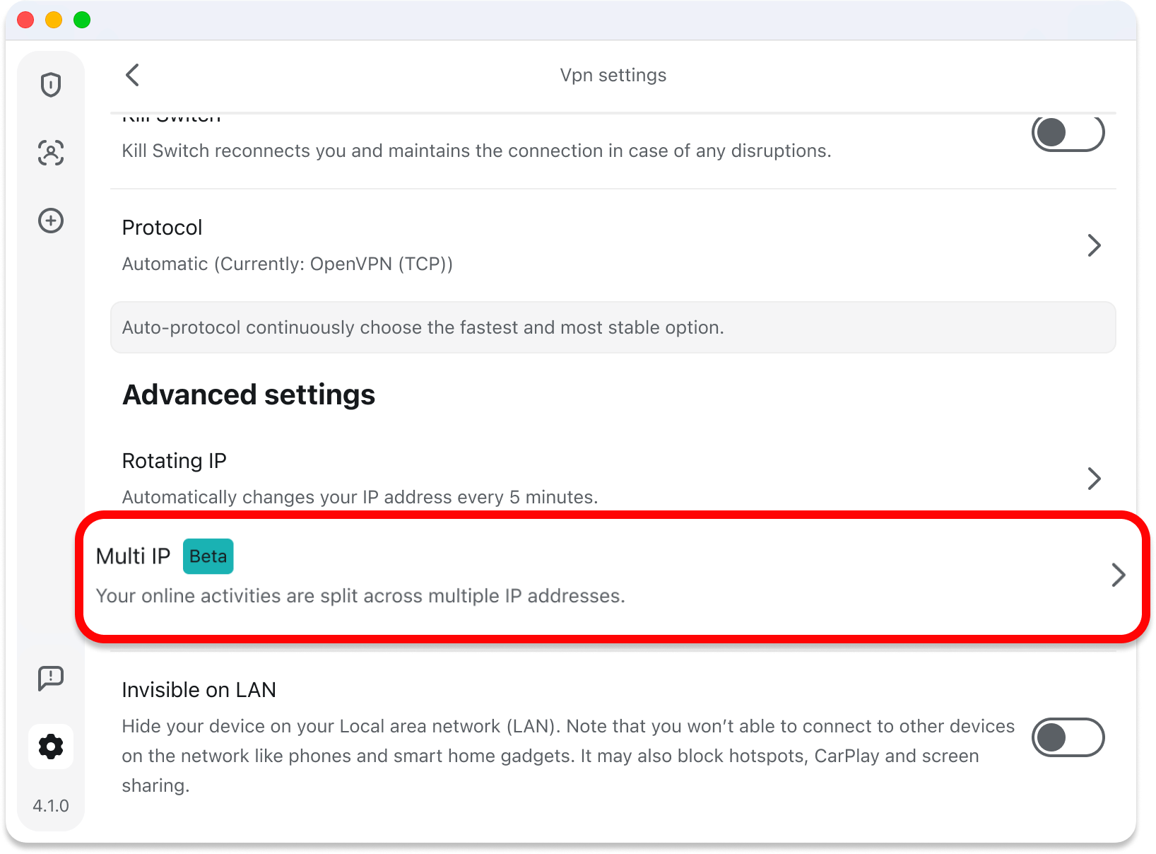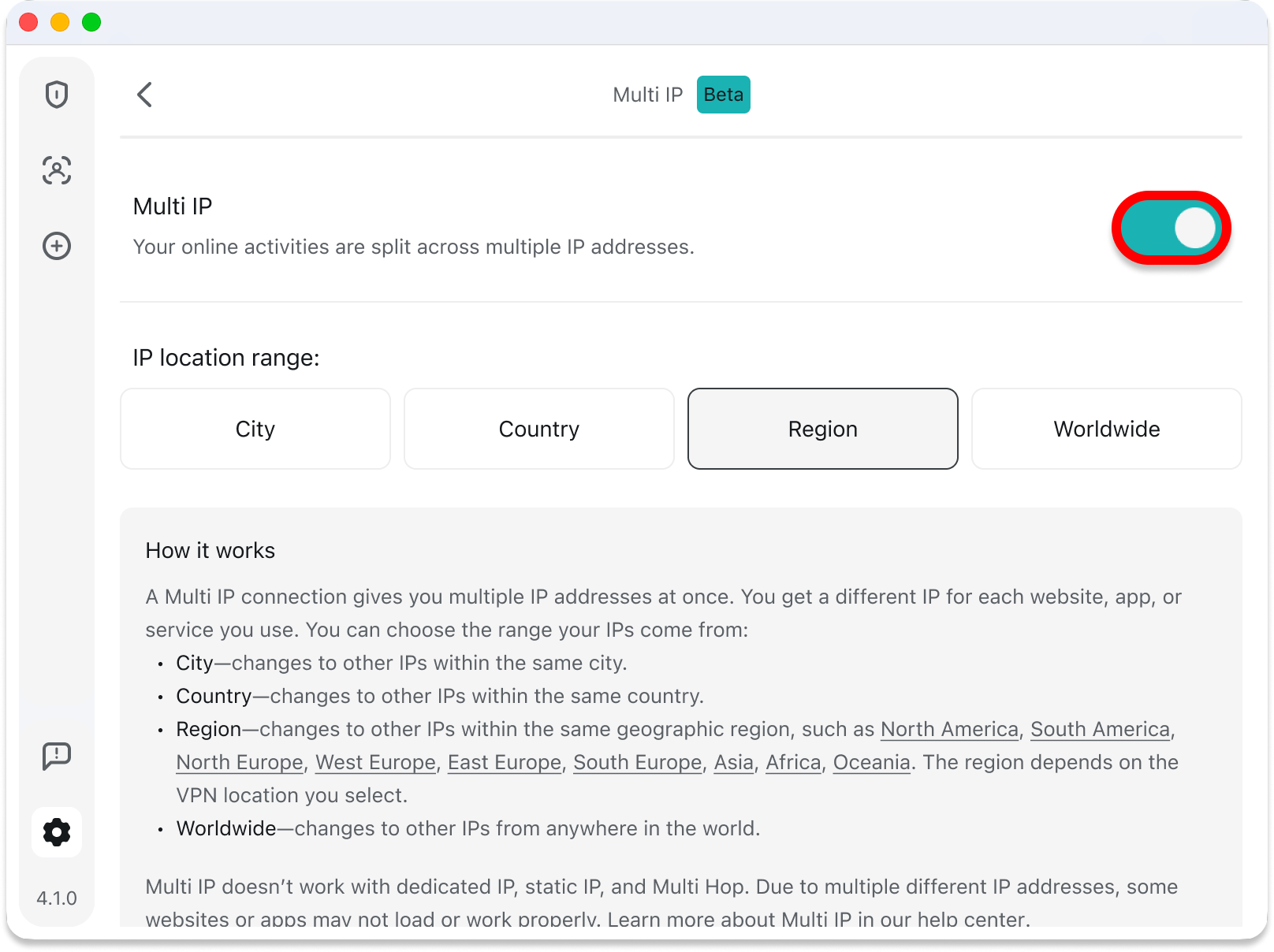 Opposite to a typical VPN connection, where all traffic is routed through a singular VPN IP address, the Multi IP feature for macOS allocates a different IP address from the selected allocation range for each app, service, and website within the same VPN session.