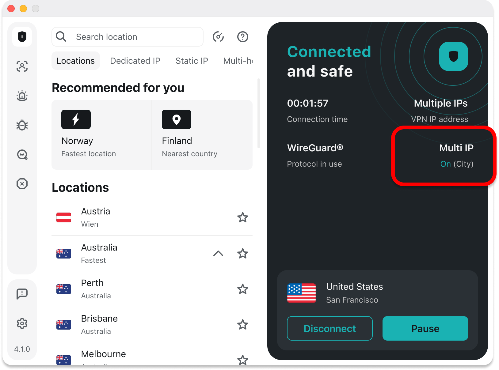 The Multi IP feature generates a unique path for each website, service, or application, meaning that when enabling this feature, you'll get a specific IP address when trying to reach Google, and then a different one when trying to access YouTube.