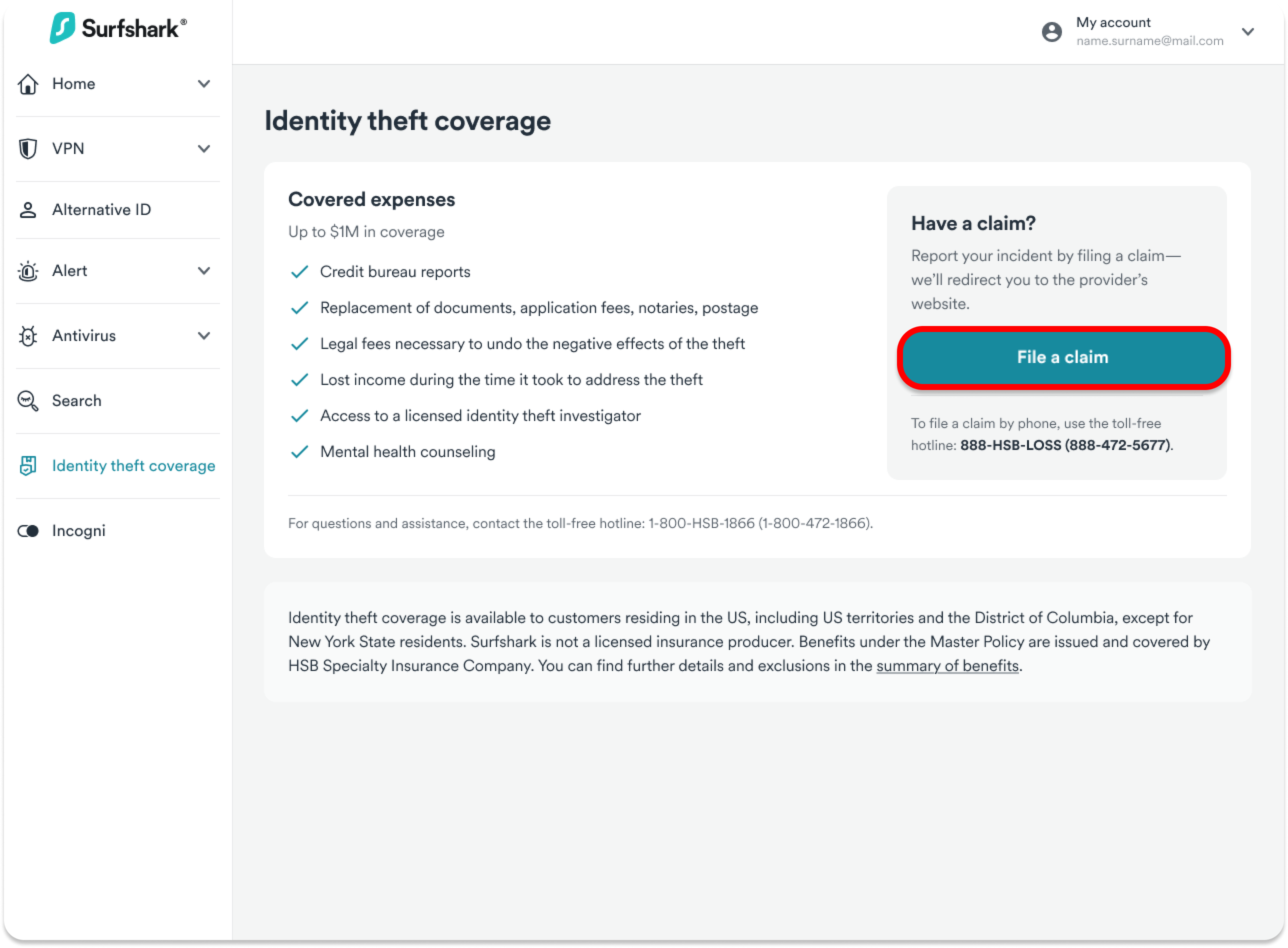 Navigating to your Surfshark account Identity theft coverage section, and clicking on File a claim.