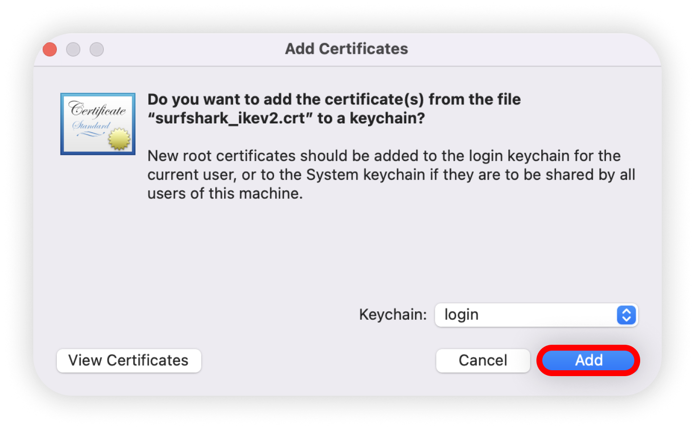 8. A Keychain Access prompt will appear asking for permission to add the Surfshark IKEv2 certificate to your login keychain. If prompted, enter your Mac credentials and click Add: