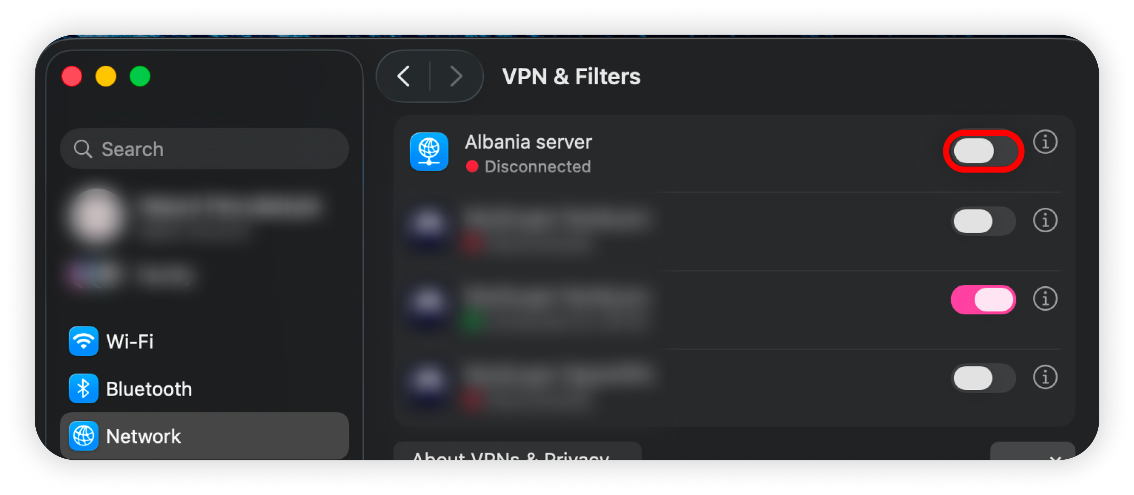 7. Locate the newly created VPN configuration and click the toggle next to it to connect: