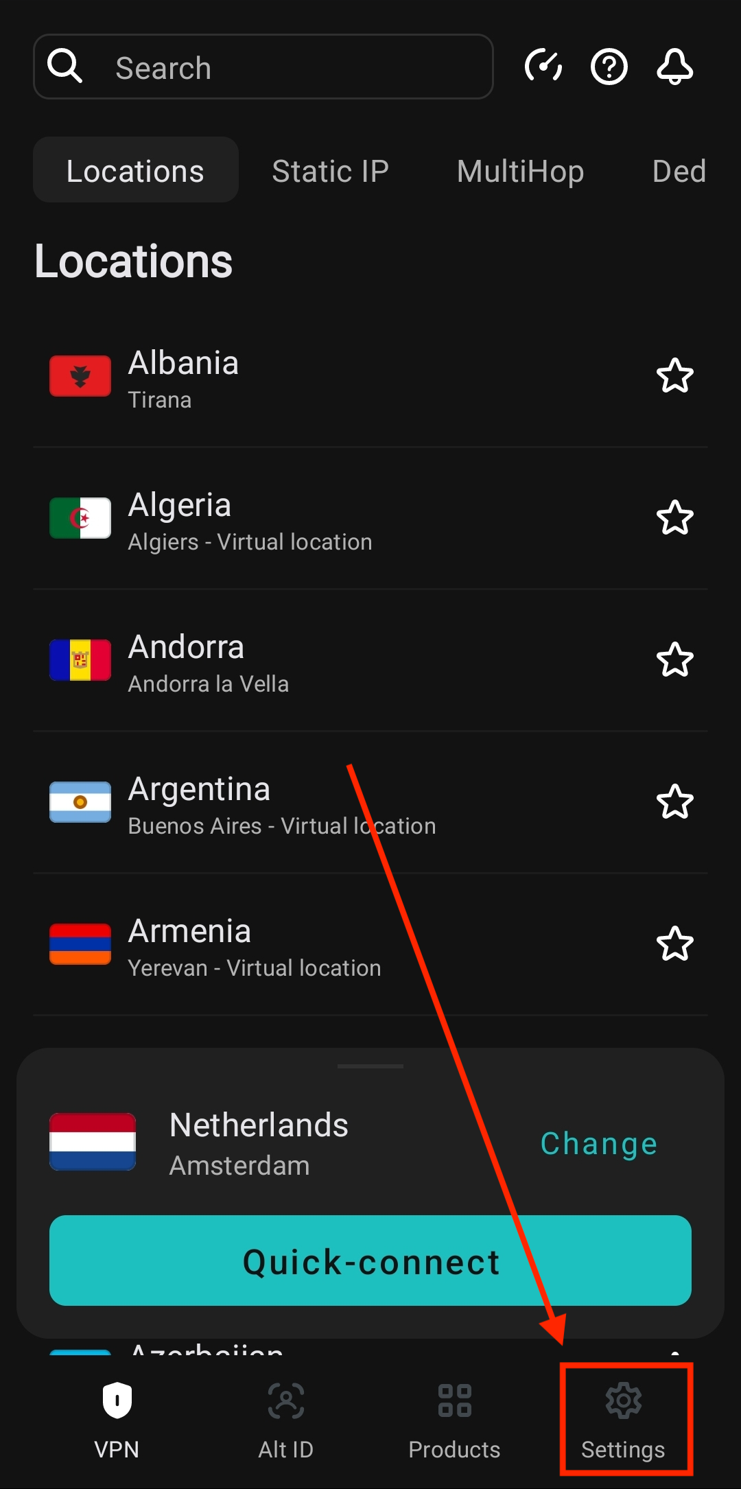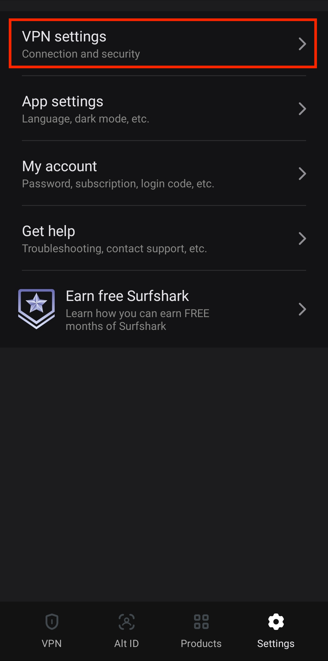 1. Open the Surfshark application and tap Settings on the bottom bar.