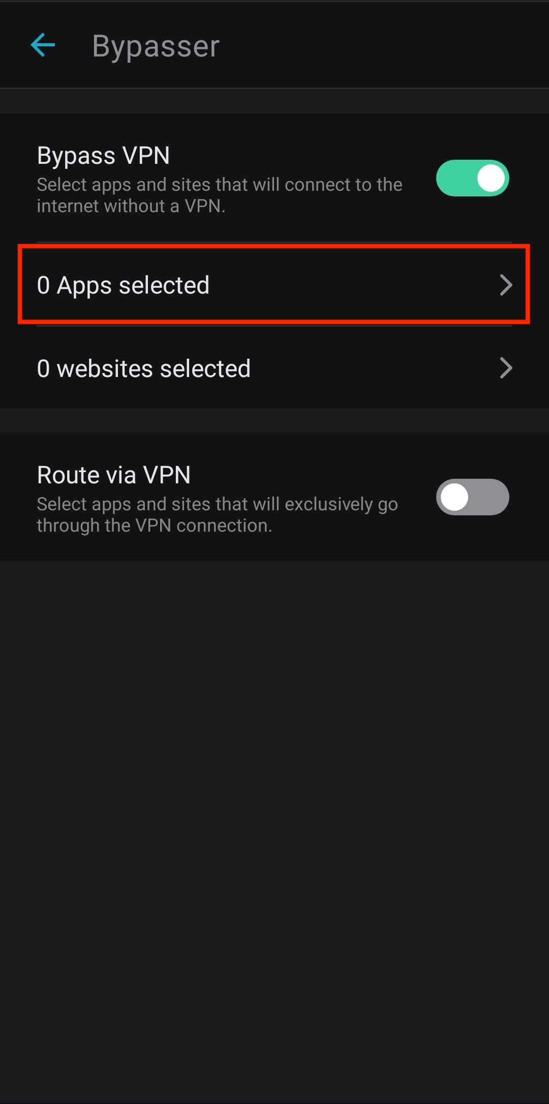 1. To select applications that will bypass the VPN, tap on the 0 Apps selected bar.
