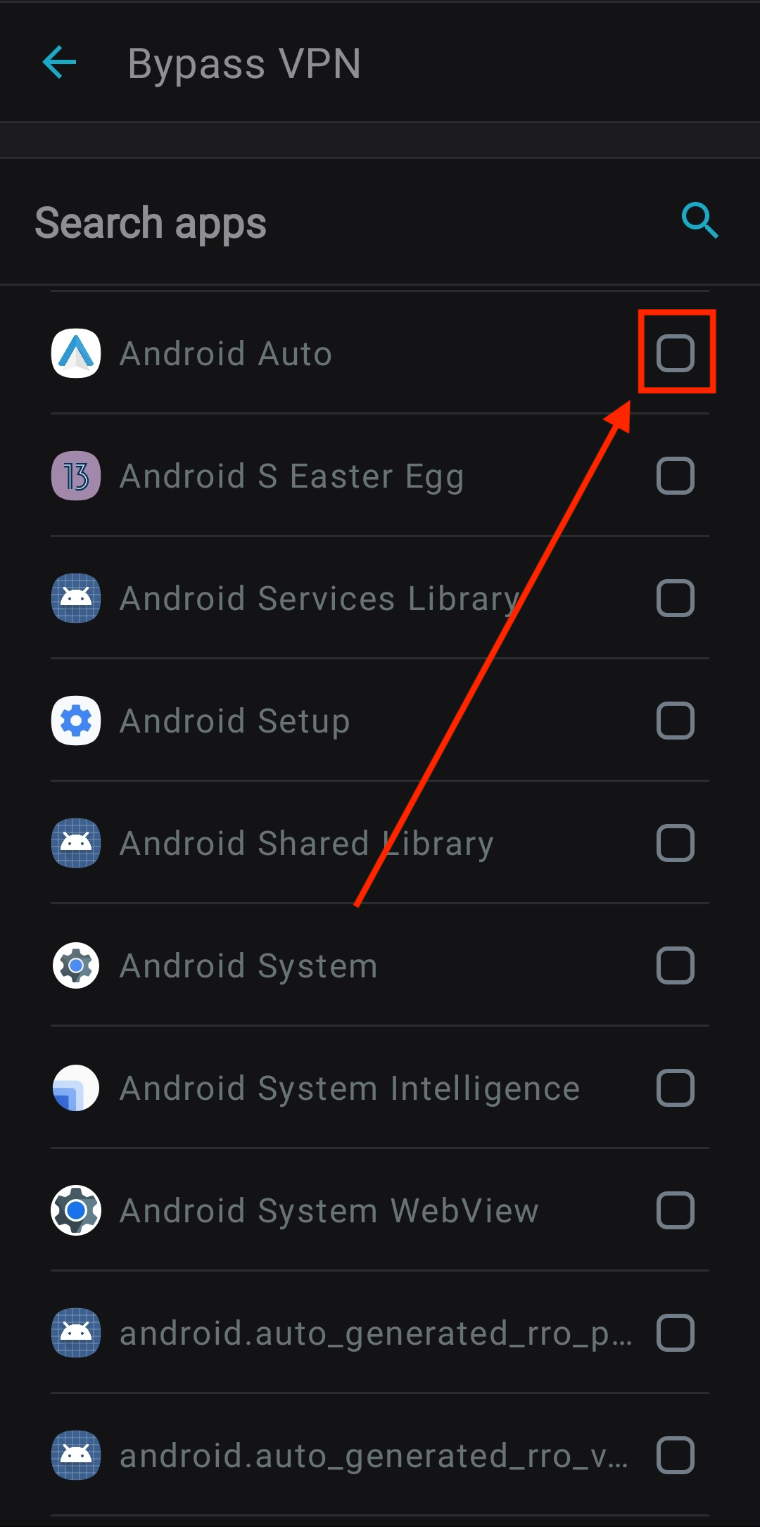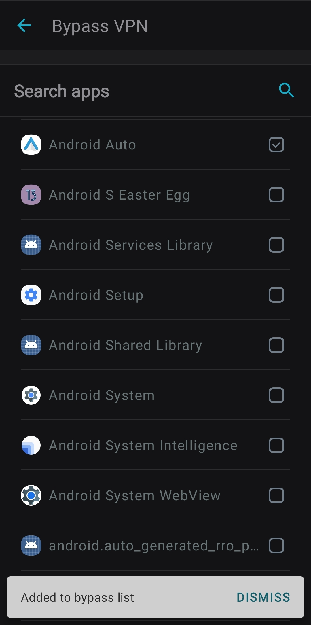 2. You will see a list of all supported applications on your device that are ready for use with Bypasser. Select the applications that you would like to bypass the VPN connection. You can do that by tapping the box on the right of the application.