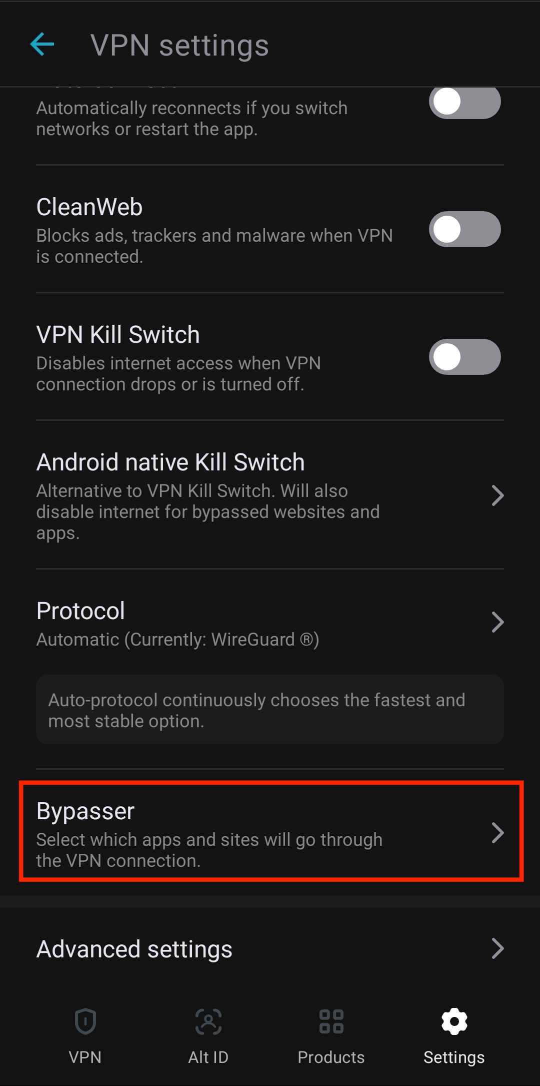 1. Bypass VPN, which blocks selected applications and websites from using the VPN connection. These will run through your normal internet connection.