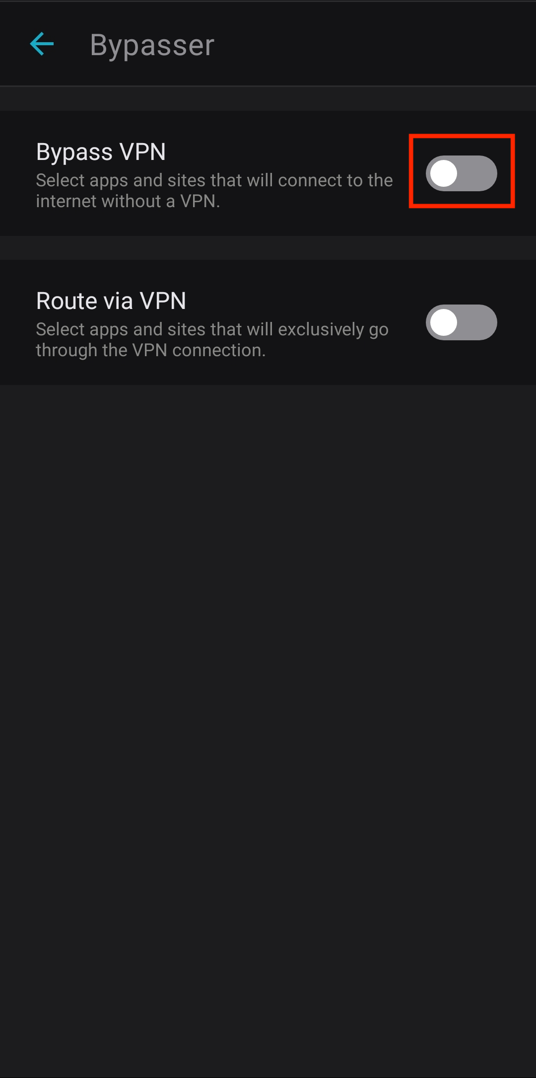 4. Select which method you are going to use. This guide will go over the Bypass VPN option, which has an identical setup process to Route via VPN. To enable it, tap on the switch bar on the right of the method.