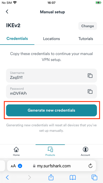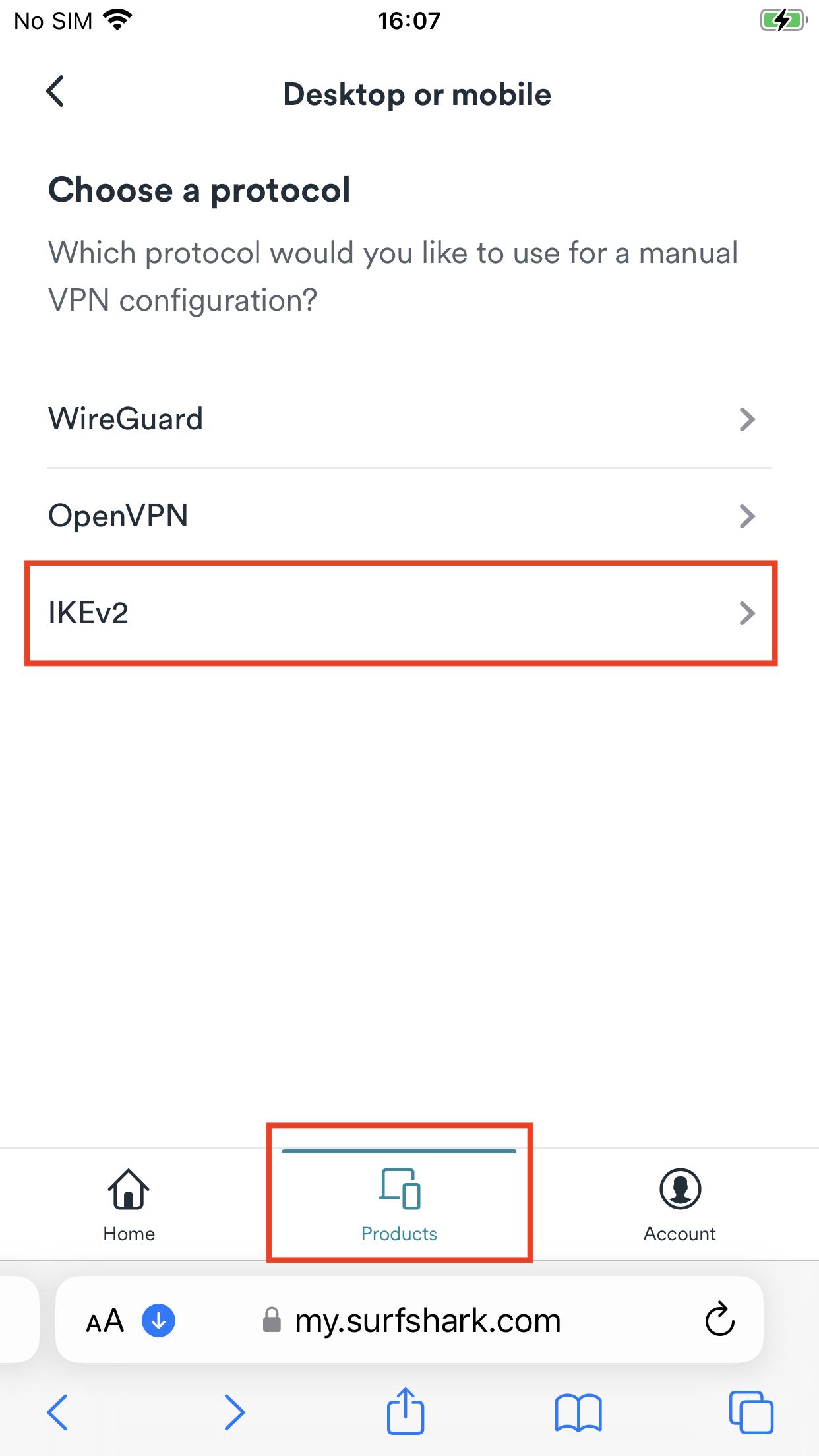 1. Enter the Surfshark login page and log in. Then, click on Products > VPN > Manual Setup > Desktop or mobile > IKEv2 to generate your credentials.