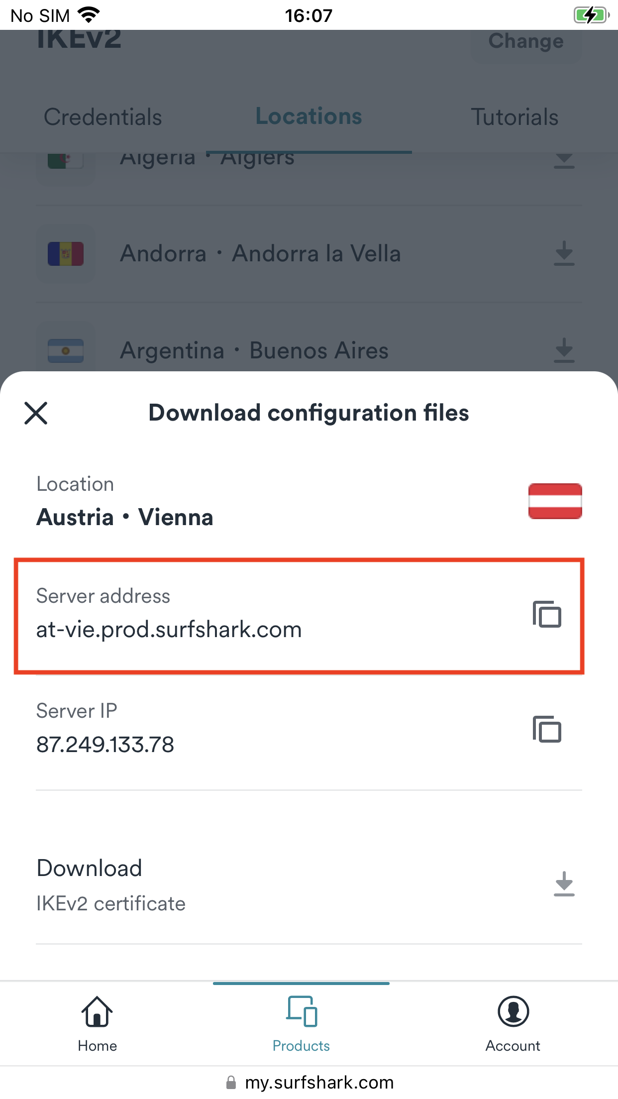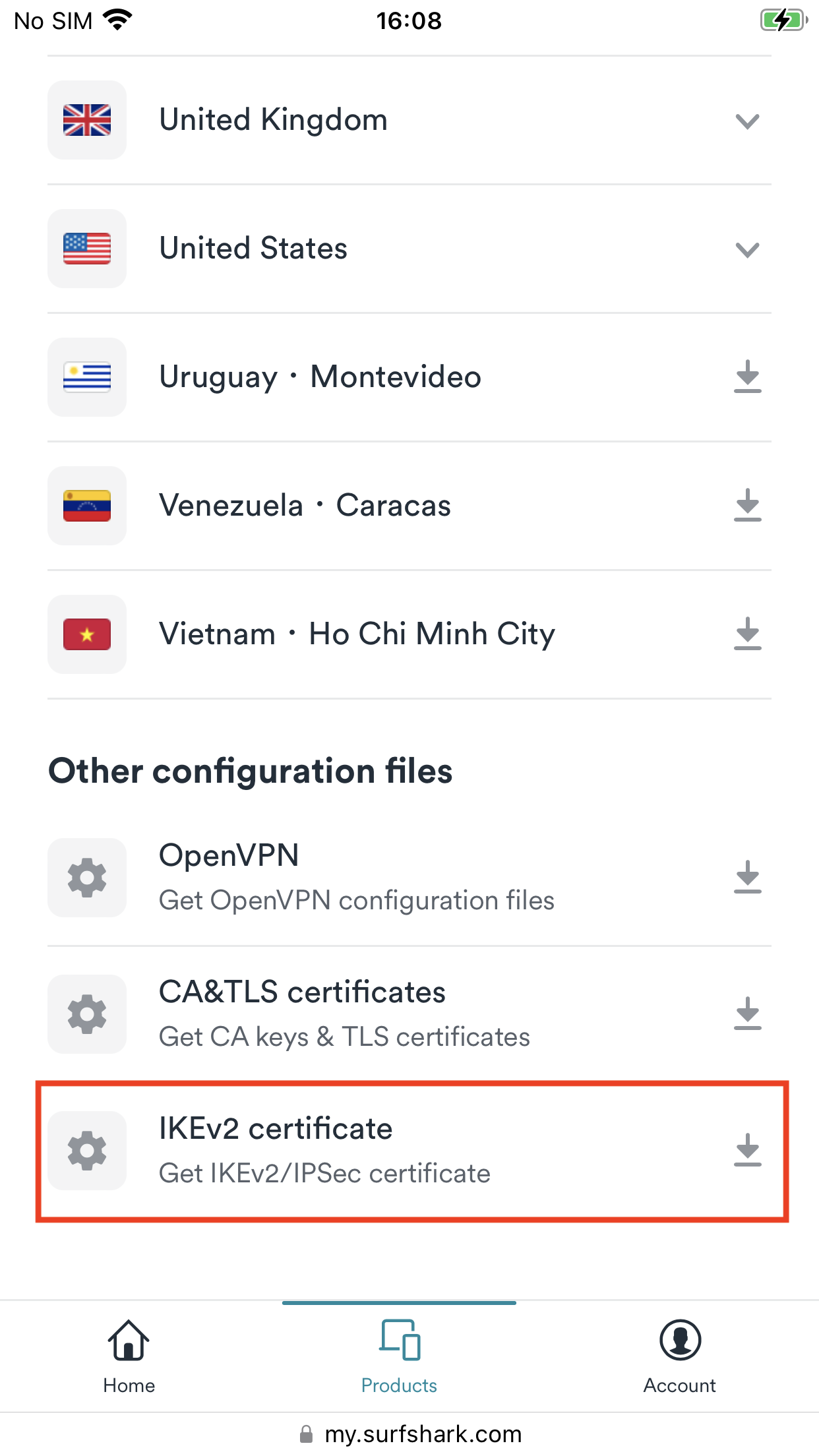 1. Scroll down to the bottom of the Locations tab. Tap on the IKEv2 certificate to start the download.