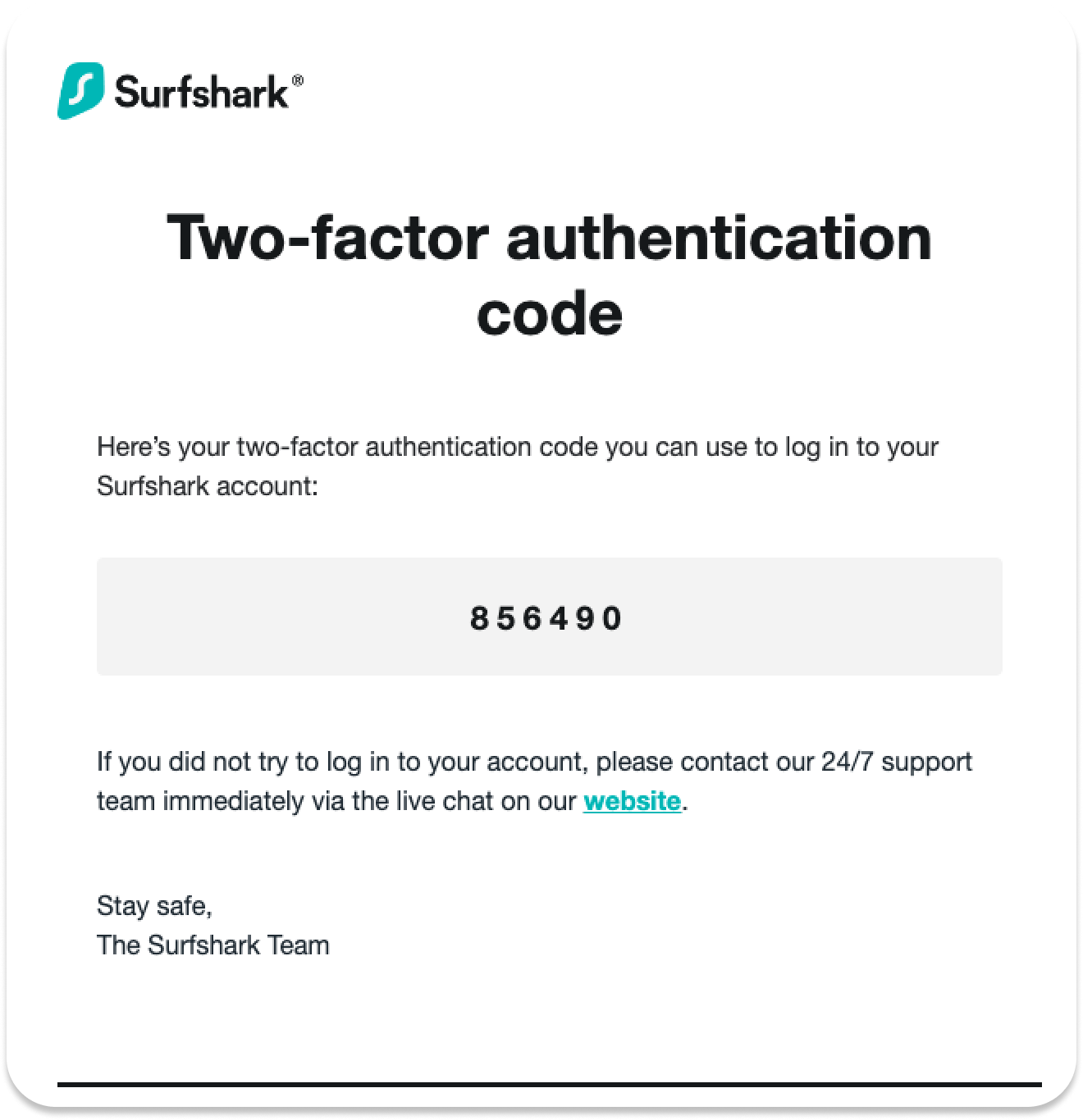 Using your email address for 2FA authentication will send you a new code each time you attempt to log into the Surfshark website or the Surfshark app. Open your email, and you should see a recent letter containing your current 2FA authentication code.