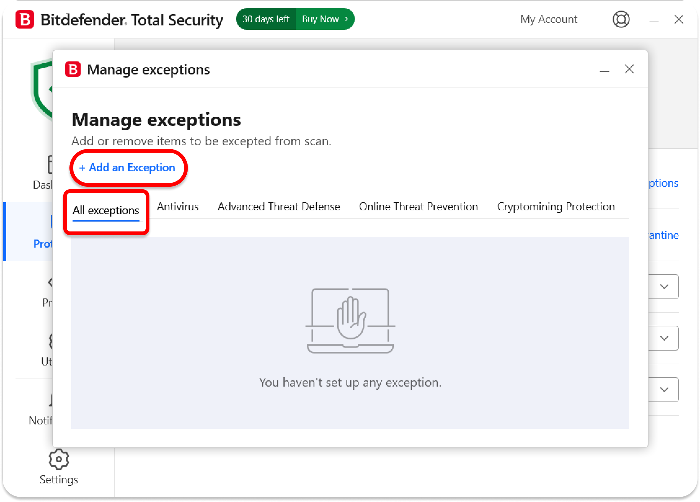 5. In the All exceptions tab, click on + Add an Exception.