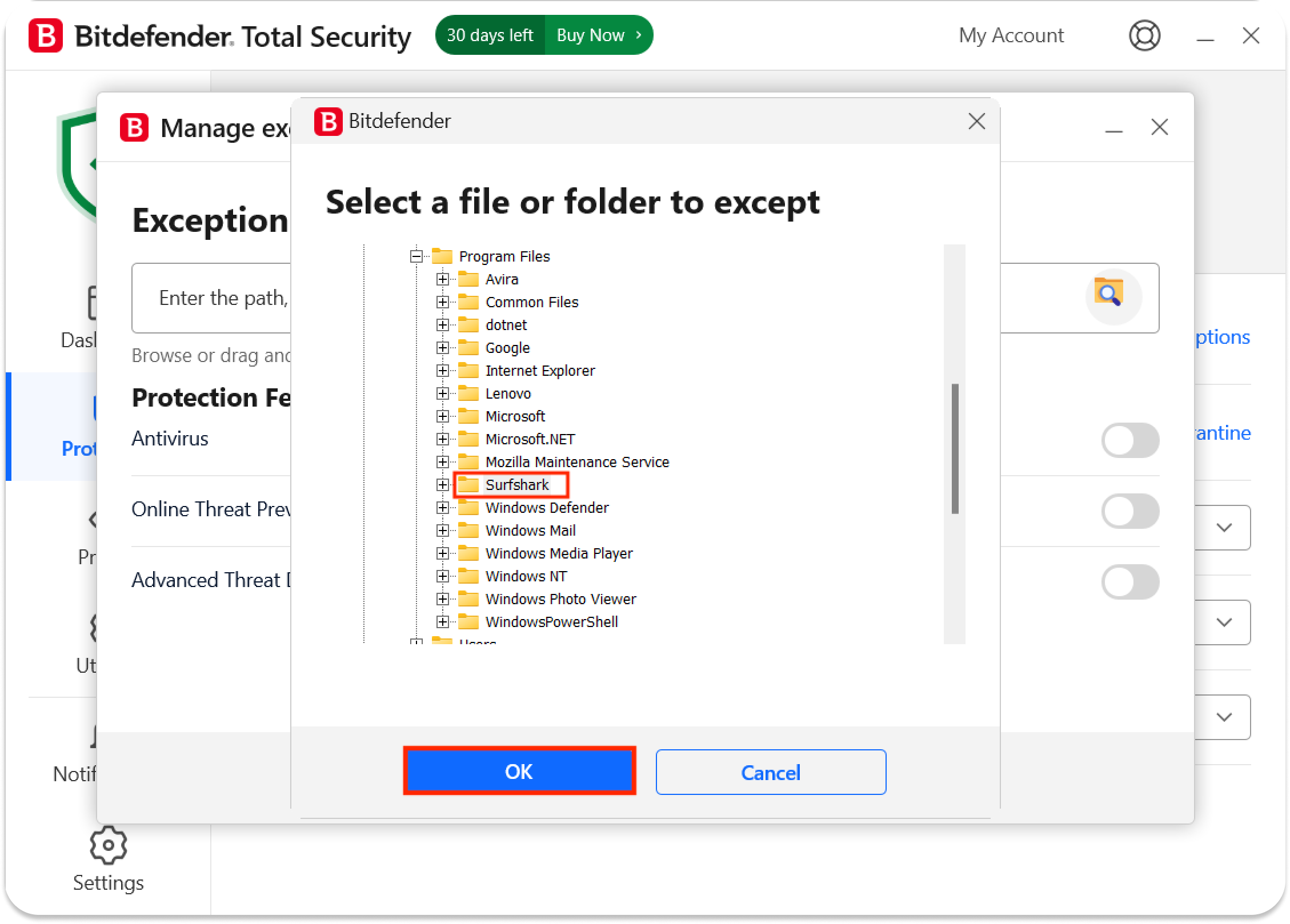 How to make an exception for Surfshark in BitDefender antivirus on Windows