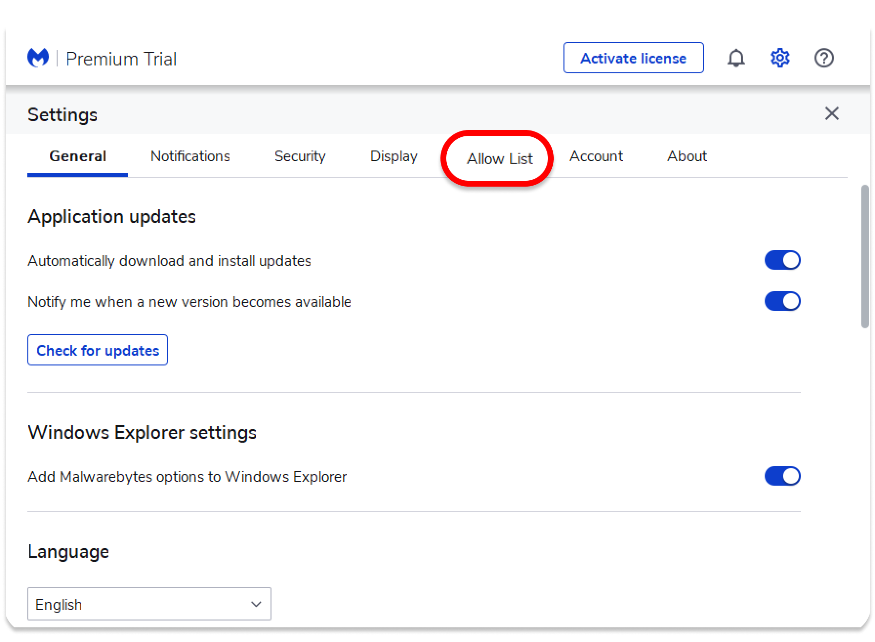 Launch the Malwarebytes app and click on the cogwheel at the top-right corner.