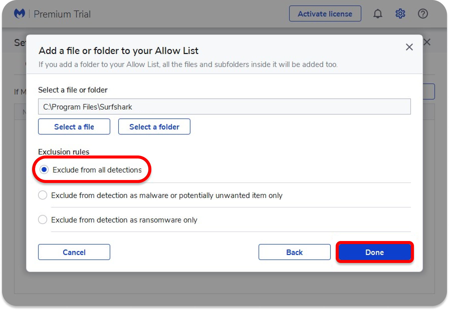 The Surfshark folder will appear on your Malwarebytes exception list.