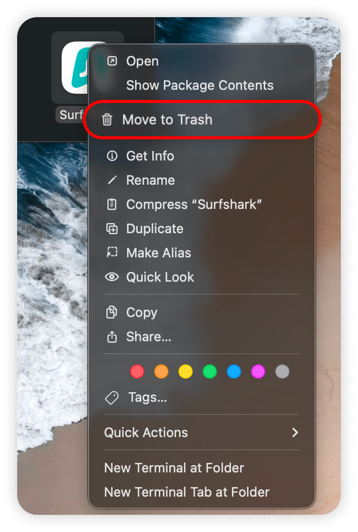 3. Locate the Surfshark application, right-click on it, and select Move to Trash: