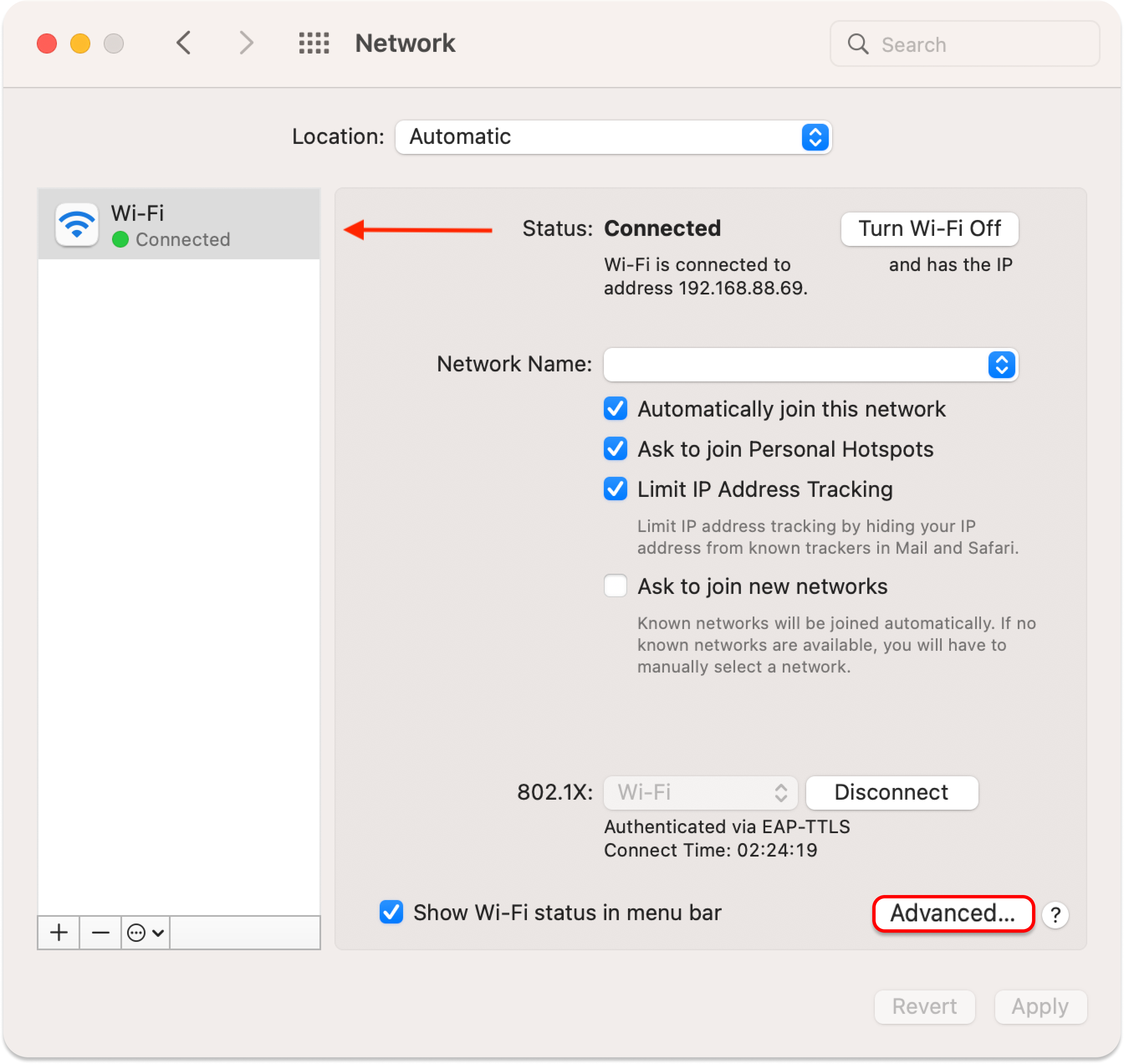 Select the network you wish to configure your DNS on. In this case, you will configure the main Wi-Fi networks' DNS. After selecting the network, click on Advanced...