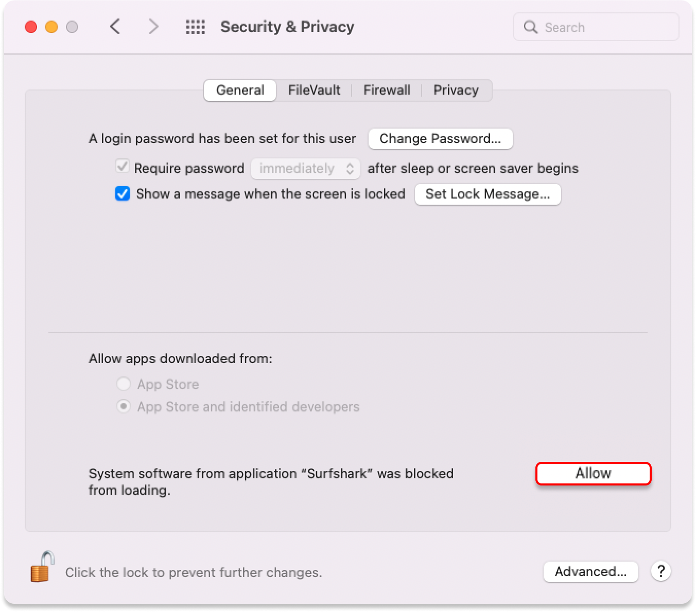 You’ll see a message indicating that Surfshark was blocked from loading. Click Allow to proceed: