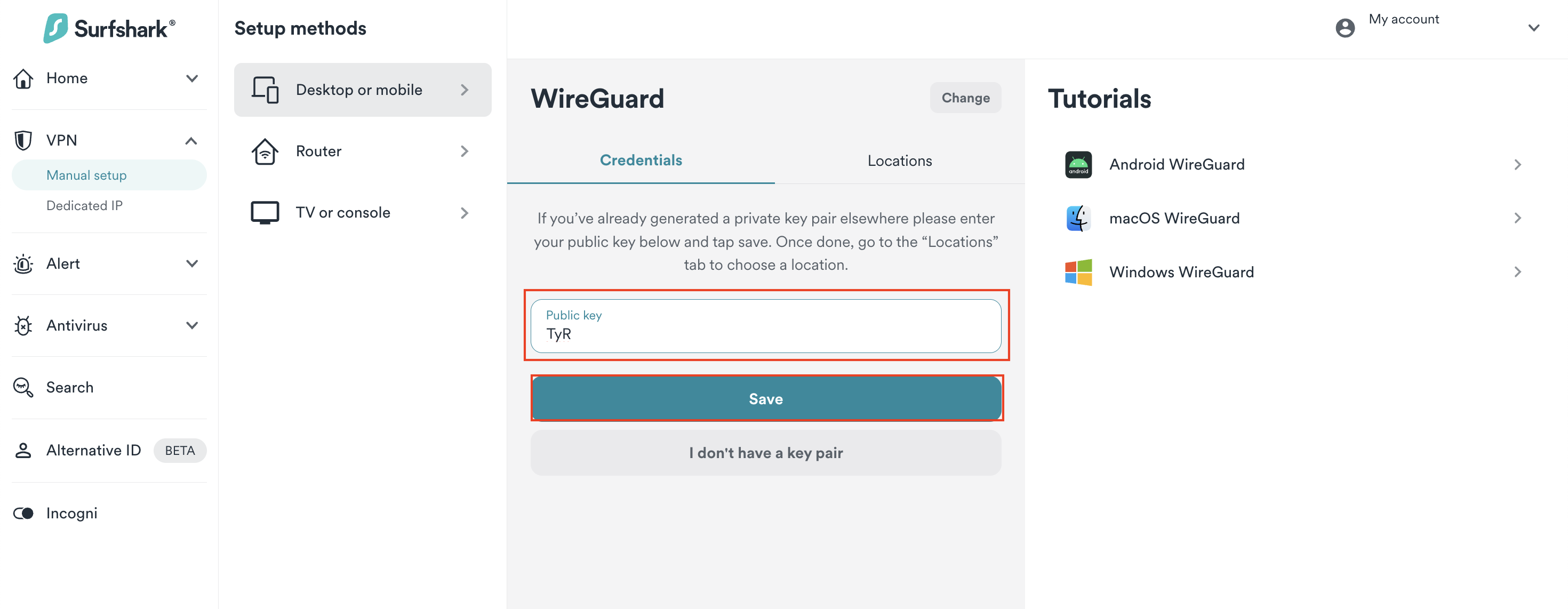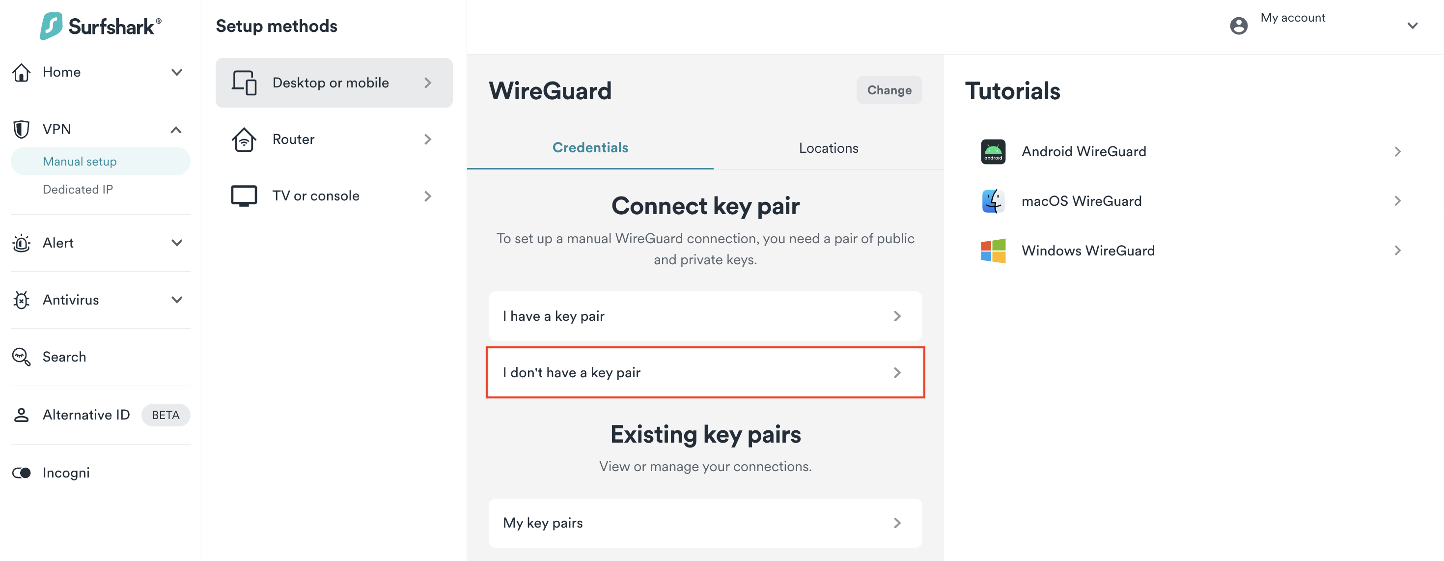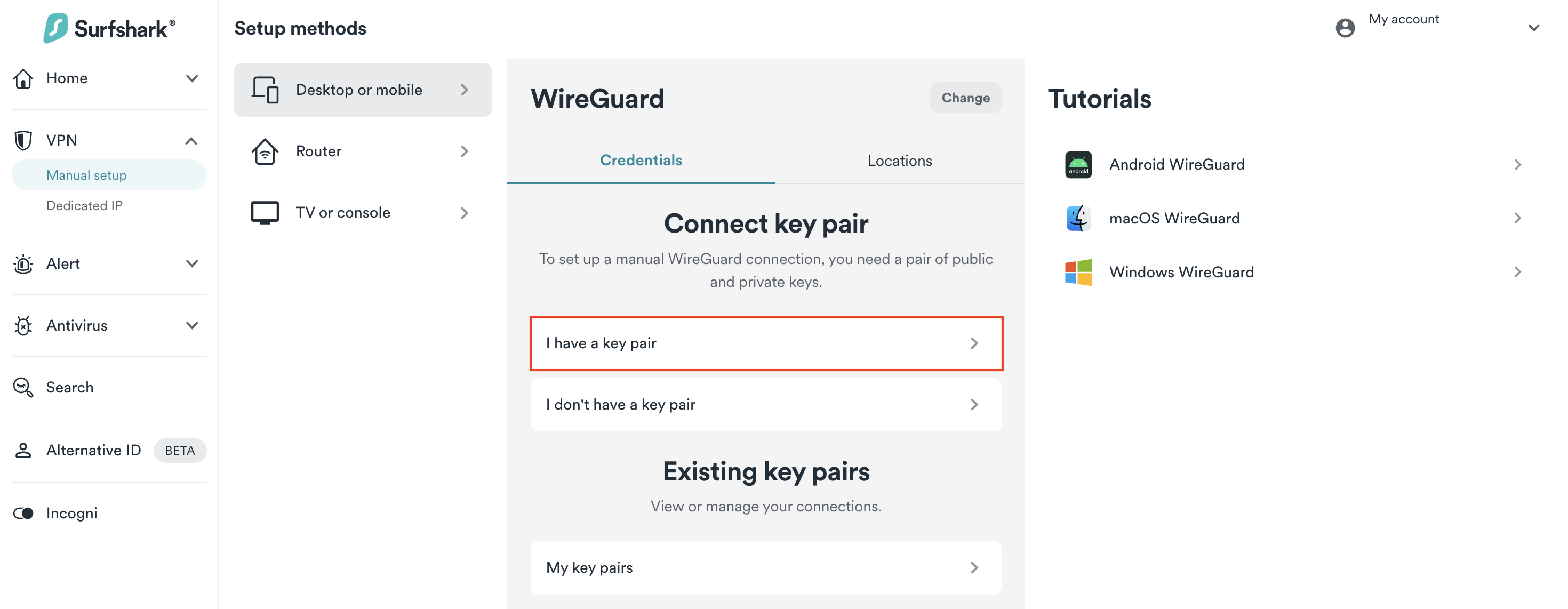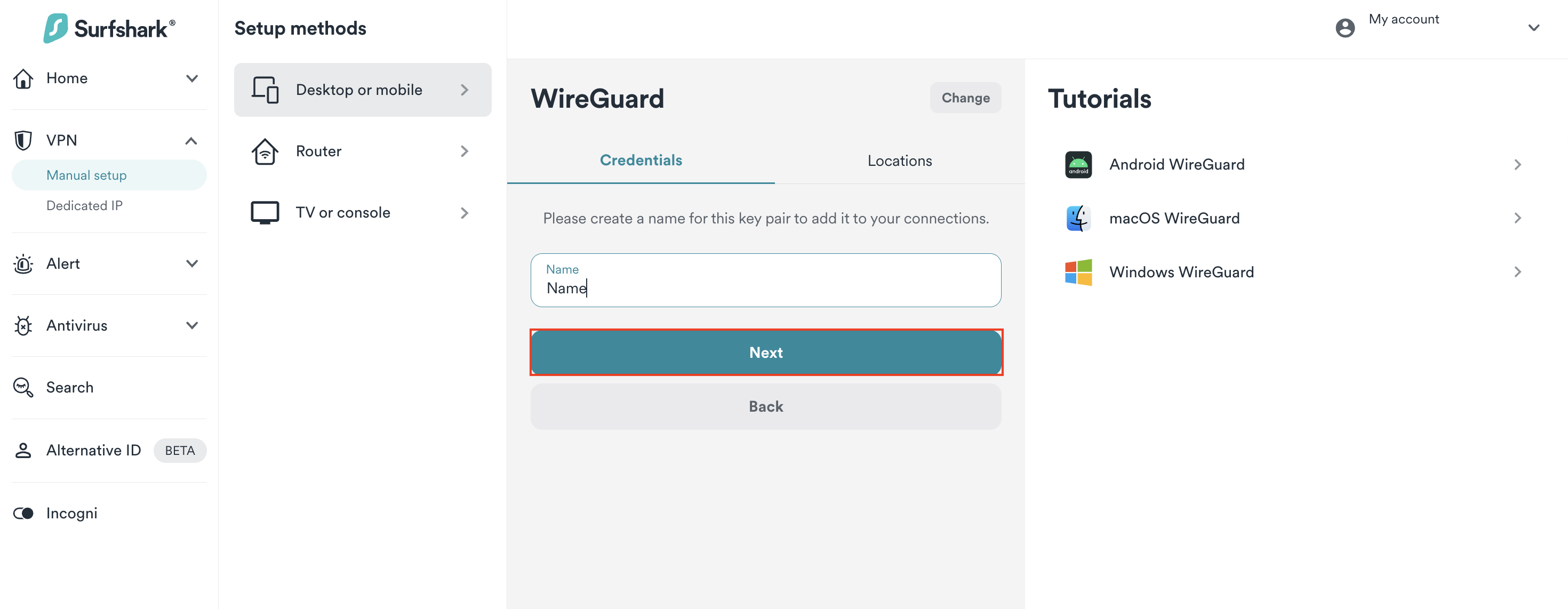 - Go to Surfshark's login page and log in. Then, visit VPN > Manual setup. Choose the Desktop or mobile option and click on WireGuard.