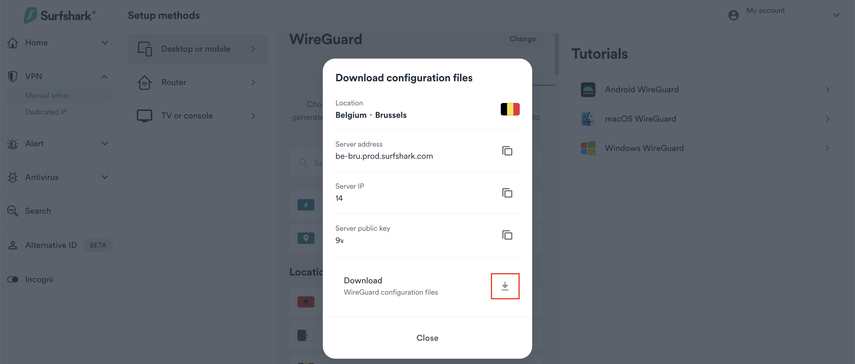 Once you have your key pair, you should see a Choose a location button. Click on it. Here, you'll find the list of available locations to connect to. Select one and hit the download button.