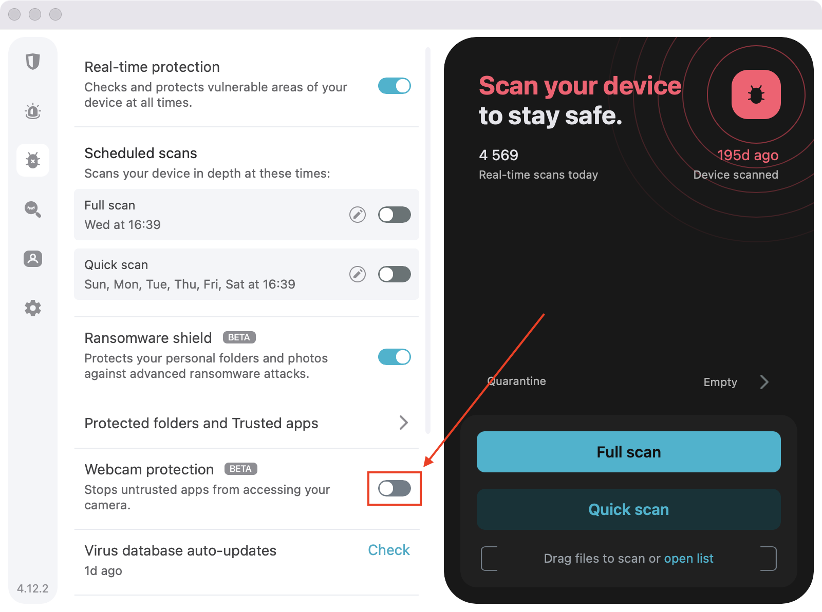 - Here, you will find the Webcam protection feature. You’ll have to install it if this is your first time using it. Do so by pressing the install button. Then, toggle the switch to enable it.